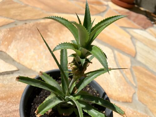 7月末にミニパインの花が咲いたのですが、その後ここまで成長しました。 こちらが7月末時点↓ この1か月強で、特に葉が大きく成長しました!肝心の実はそれほど大きくなっていませんが、少しは膨らんだかな?という感じです。 実はまだ緑色で、パイナップル特…